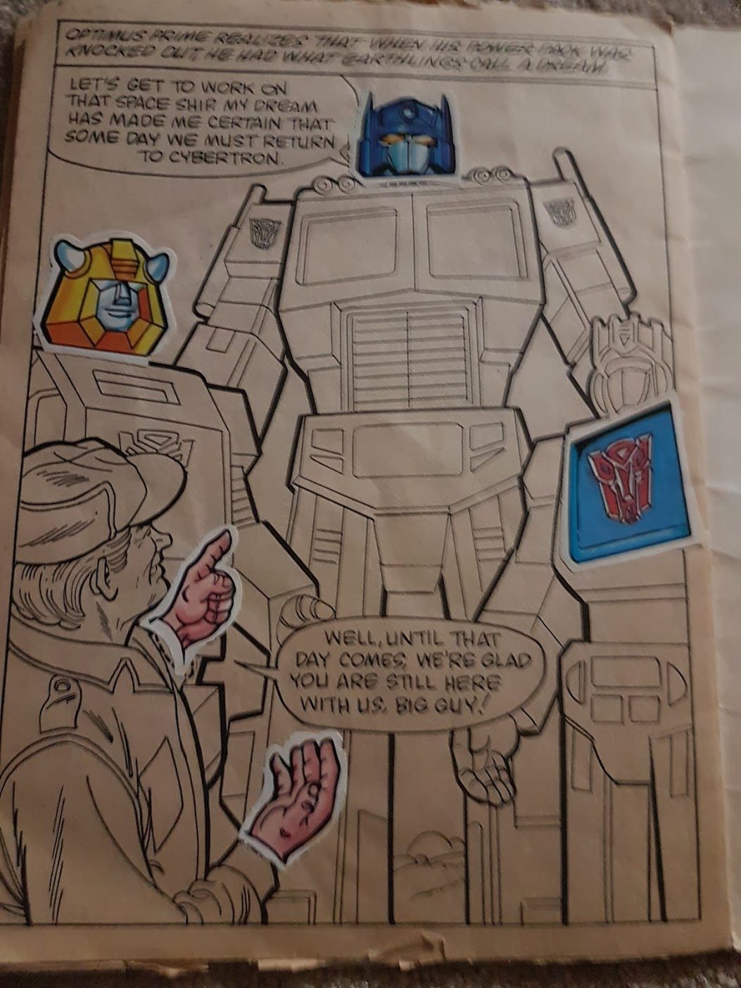 I was flipping through an old Transformers stickerbook of my childhood (now belonging to my son) and noticed this oddity – Unmistakably Soundwave, with an Autobot symbol, standing with Autobots.
